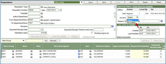 1. Open the rejected request/indent to be re-instated in the main requisition screen.