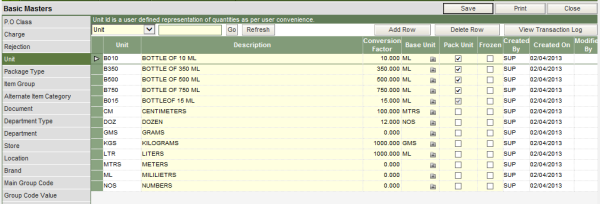 V. The checkbox in the column of Pack Unit should be ticked, if the same code needs to be defined as a pack type for items. The system will automatically create the same code as a pack id in the Pack Type master, on ticking the checkbox.