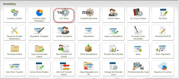 To access the screen, click the option of VAT setup in the main menu of the Inventory module.