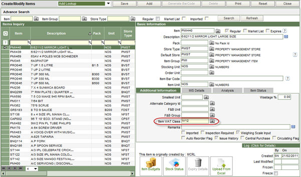 Once the Item VAT Class is created in this section, the same has to be defined against each item in the Create/Modify Items screen