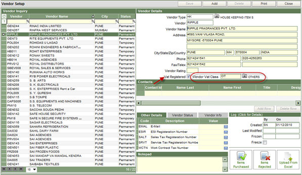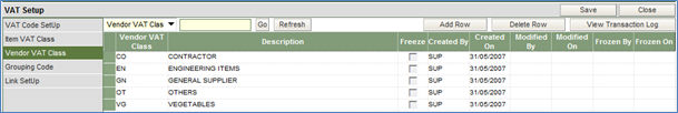 Once the Vendor VAT class is created in this section, it has to be defined against each vendor/supplier who is VAT registered. This is done in the Vendor Master screen as:
