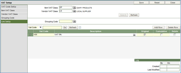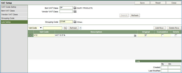 2. Click the Search button. In case the link has been already setup for the specific Item Vat Class, the system will display the same in the lower half of the screen, in the spread sheet. Else, the system will prompt to do the link setup.